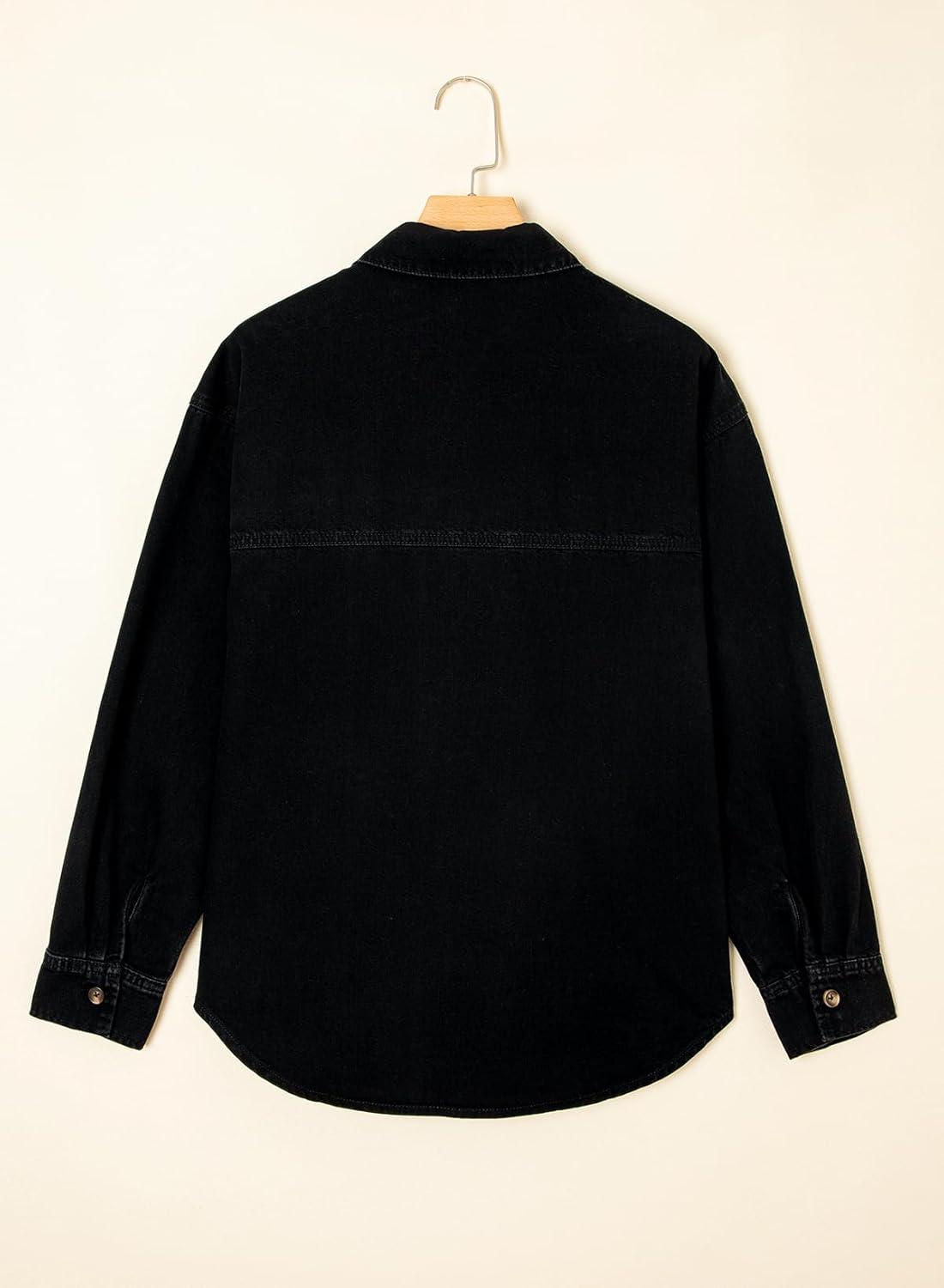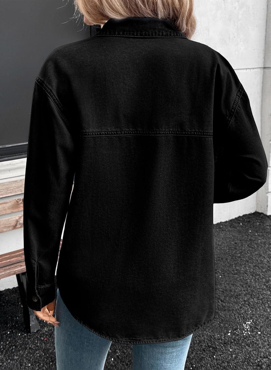 Sidefeel Women Denim Shirts Oversized Long Sleeve Button Down Blouse V Neck Casual Top Shackets(Black)