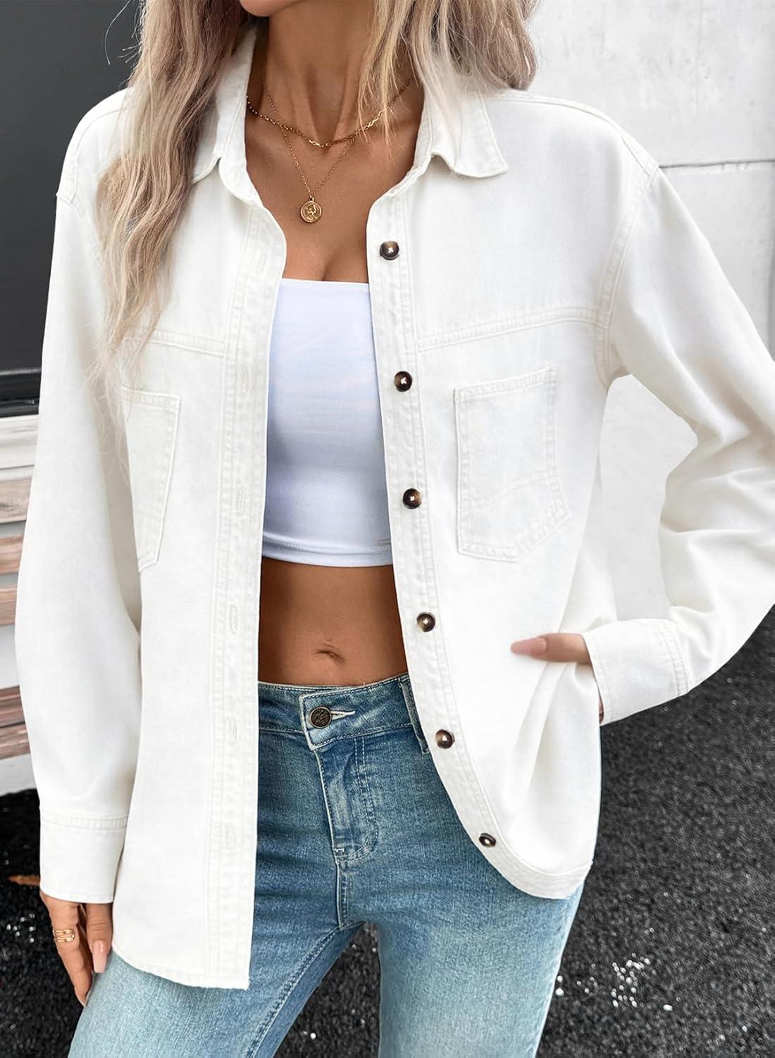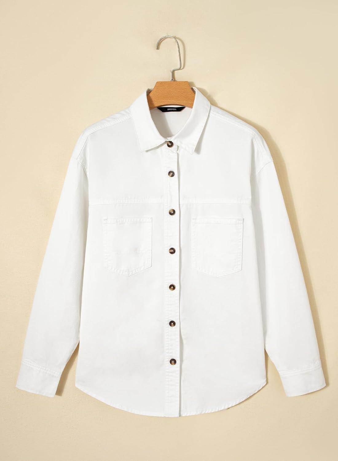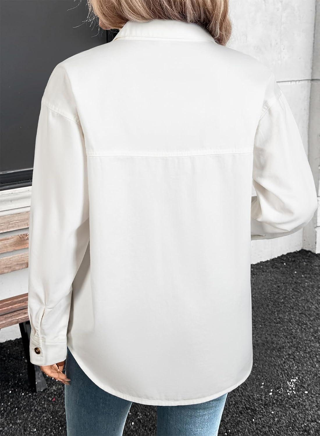 Sidefeel Women Denim Shirts Oversized Long Sleeve Button Down Blouse V Neck Casual Top Shackets(White)