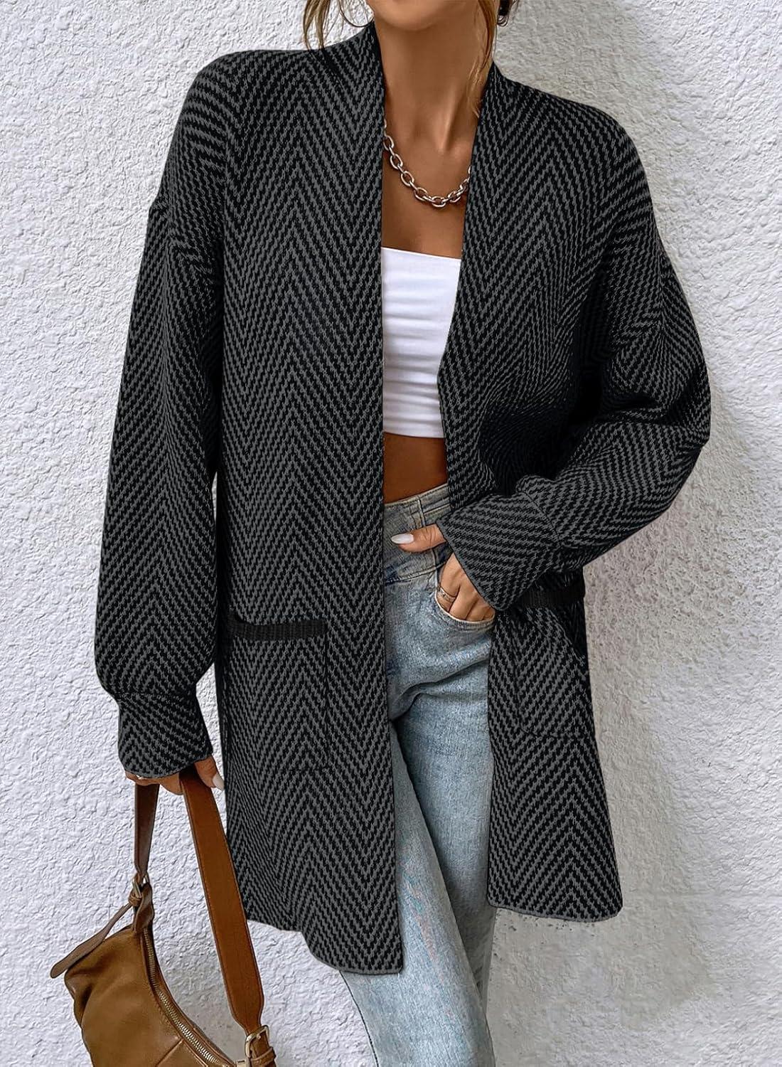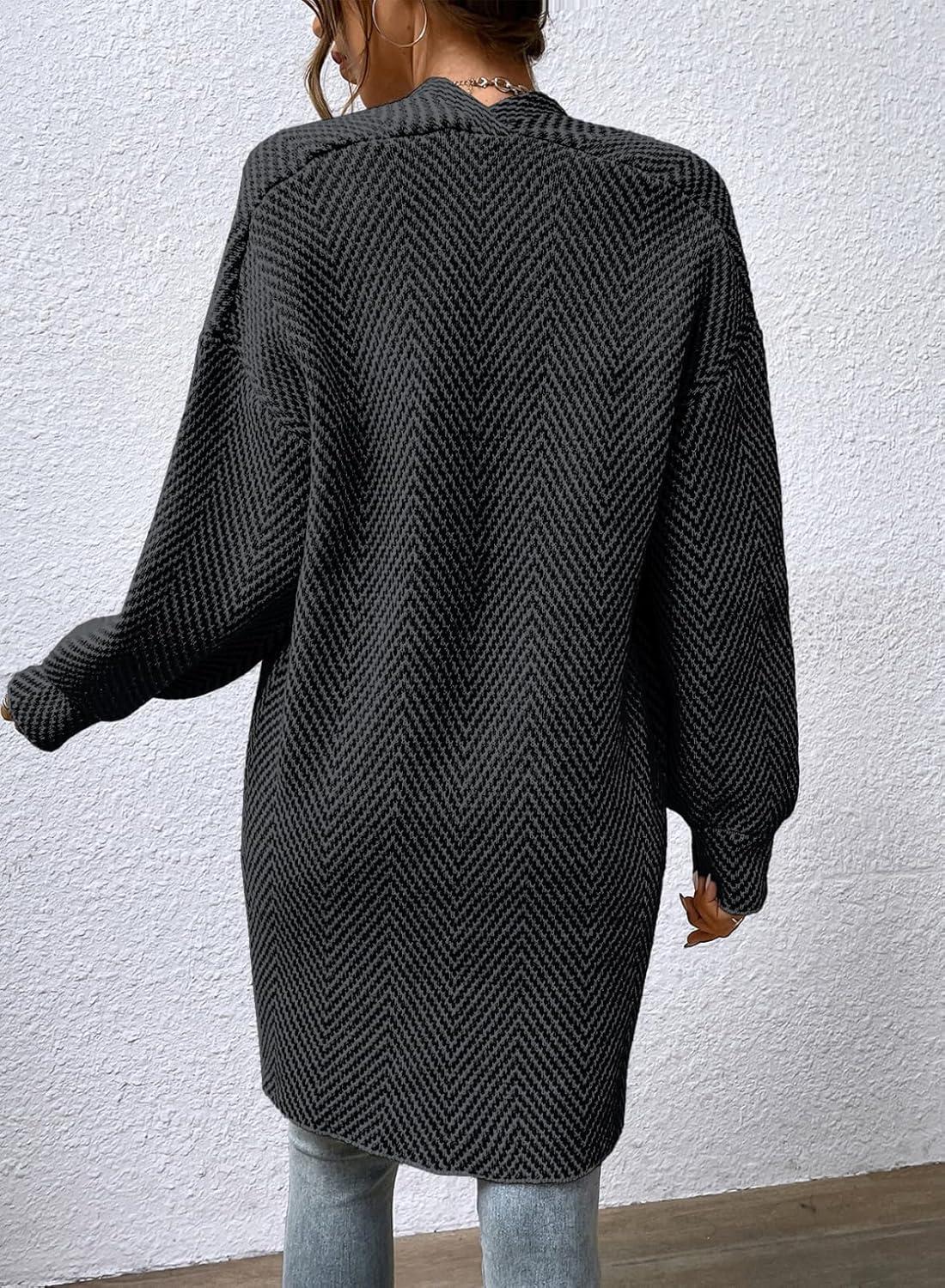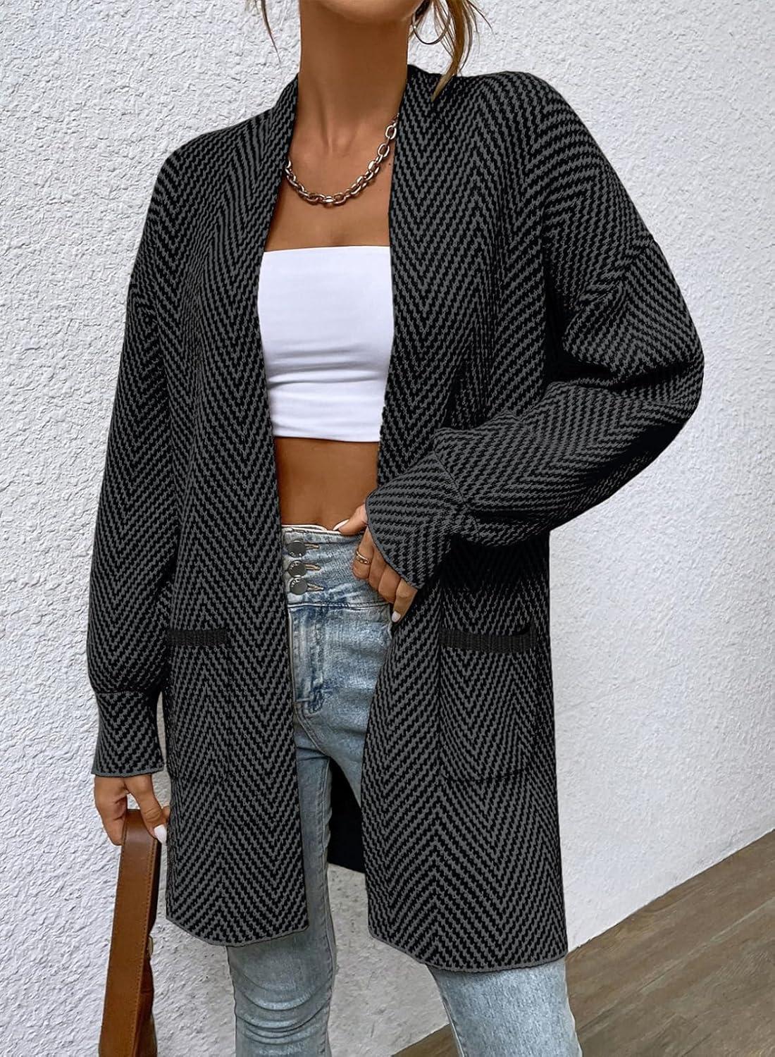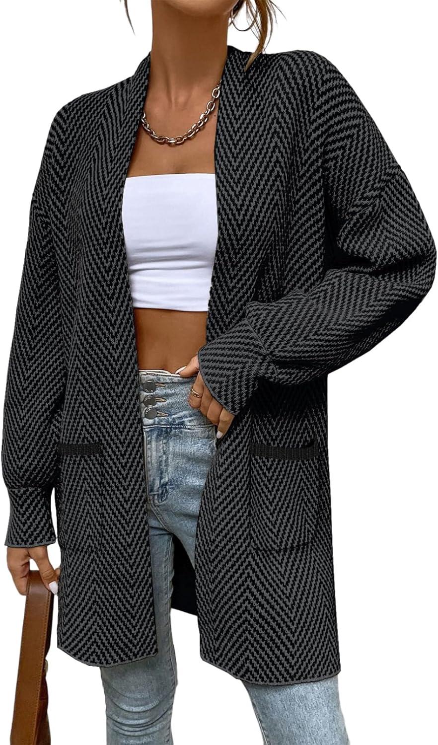 Sidefeel Womens 2025 Fall Outfits Long Sleeve Open Front Striped Cardigan Sweaters Chevron Chunky Knit Sweaters Coat(Black and Gray)