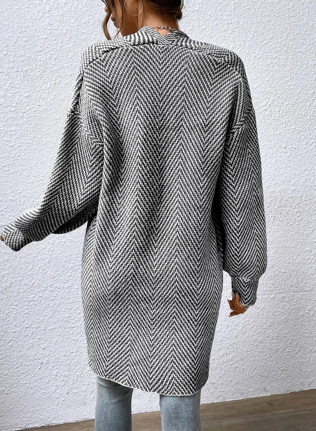 Sidefeel Womens 2025 Fall Outfits Long Sleeve Open Front Striped Cardigan Sweaters Chevron Chunky Knit Sweaters Coat(Black and Gray)