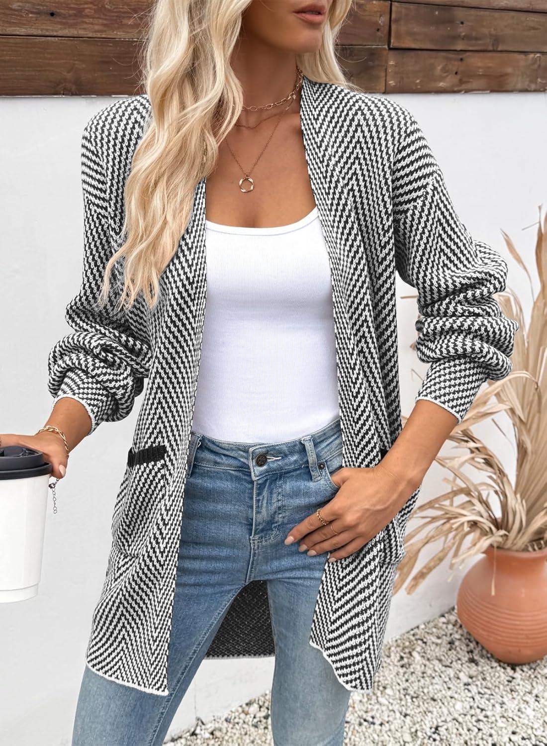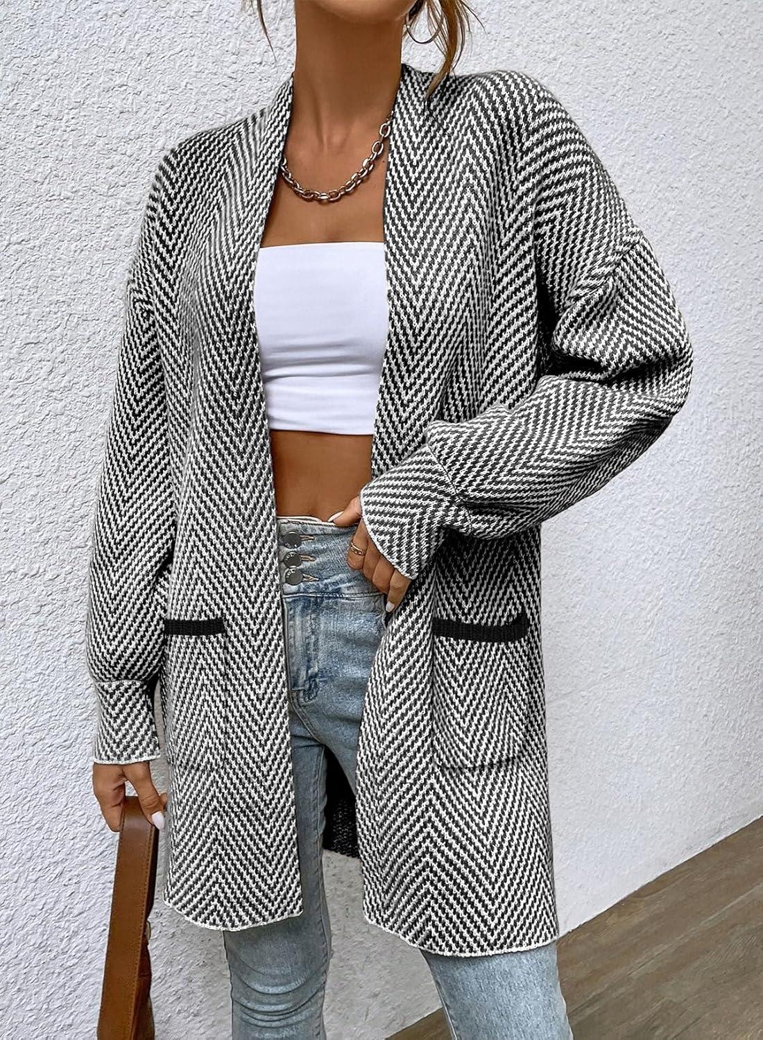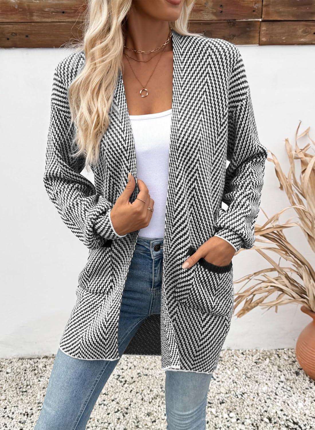 Sidefeel Womens 2025 Fall Outfits Long Sleeve Open Front Striped Cardigan Sweaters Chevron Chunky Knit Sweaters Coat(Black and White)