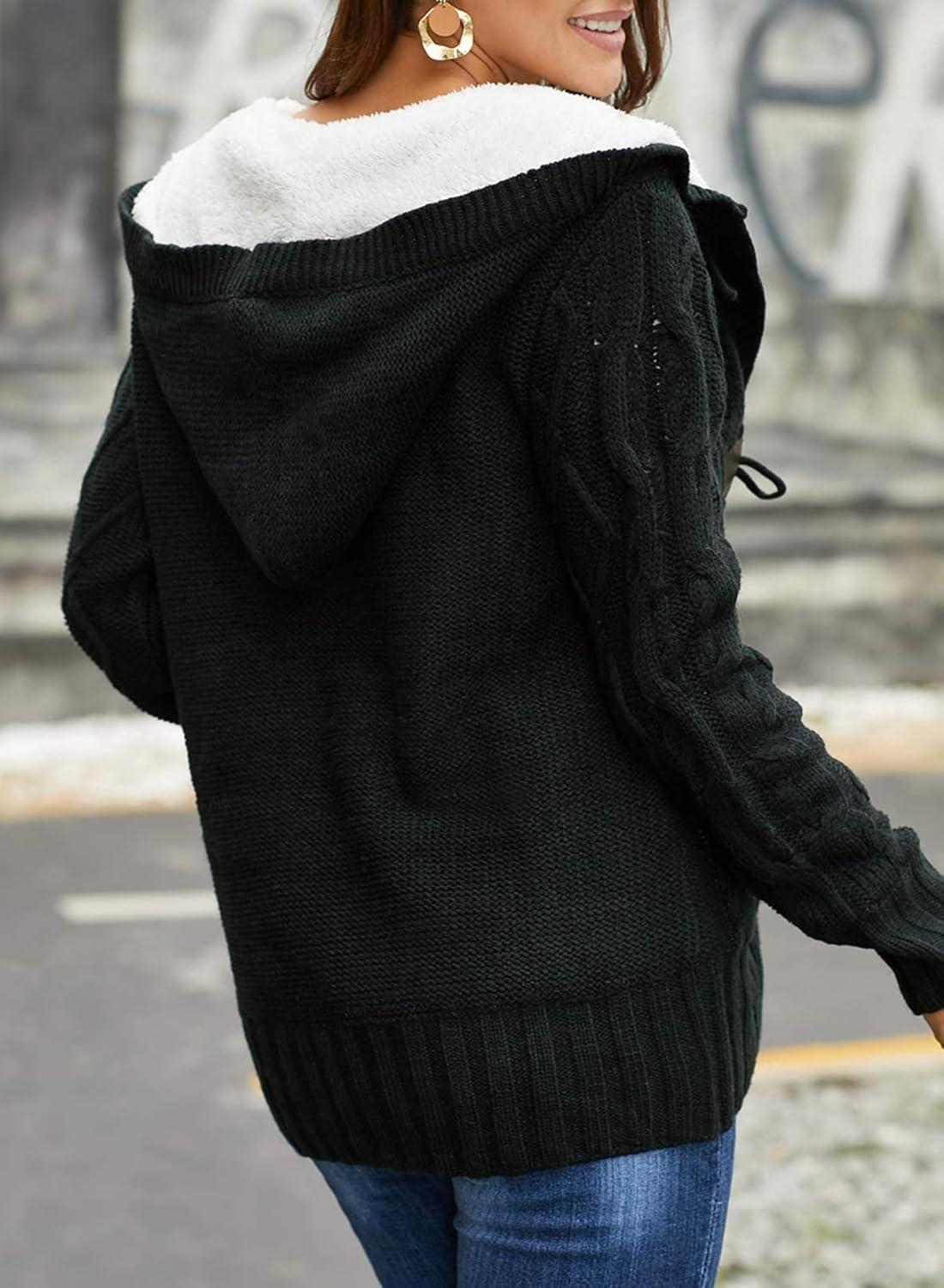 Sidefeel Women's Cardigan Sweaters Hooded Fleece Lined Button Down Winter Sweater Coat(K-black)