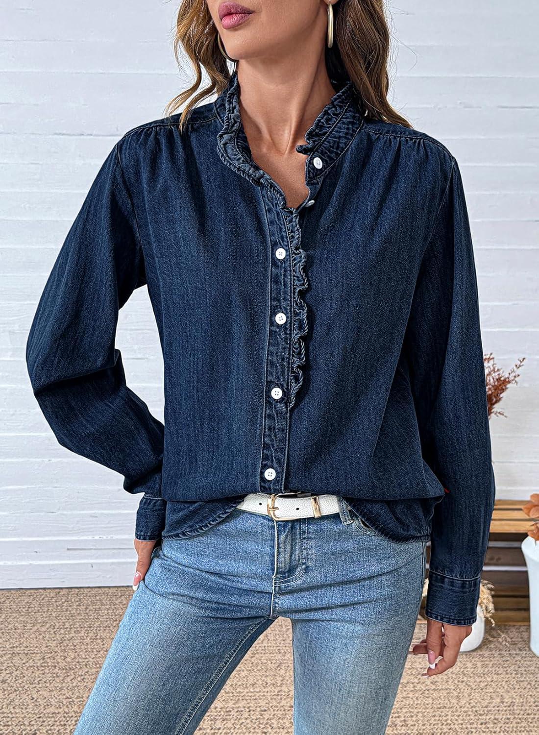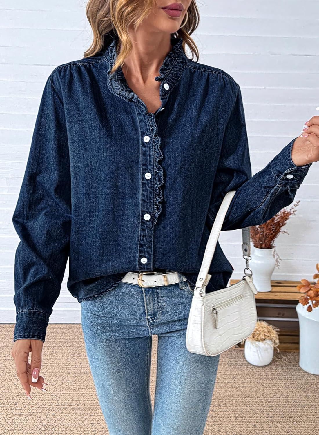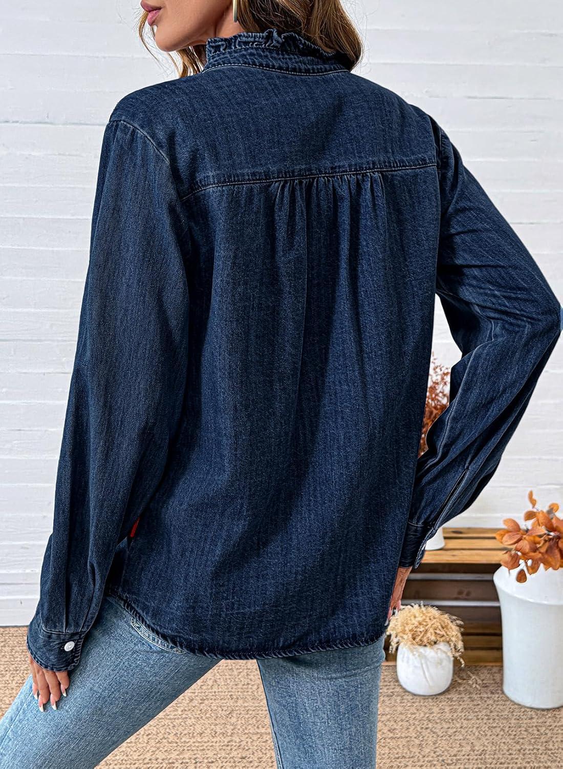 Sidefeel Womens Denim Shirt Button Down Long Sleeve Ruffled Edge Jean Blouses Tops(Dark Blue)