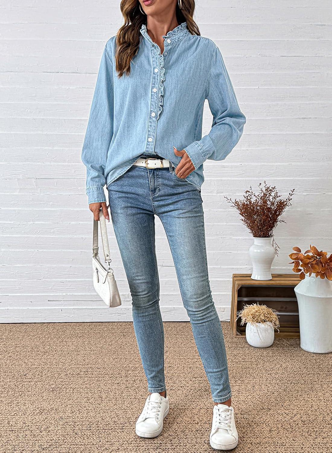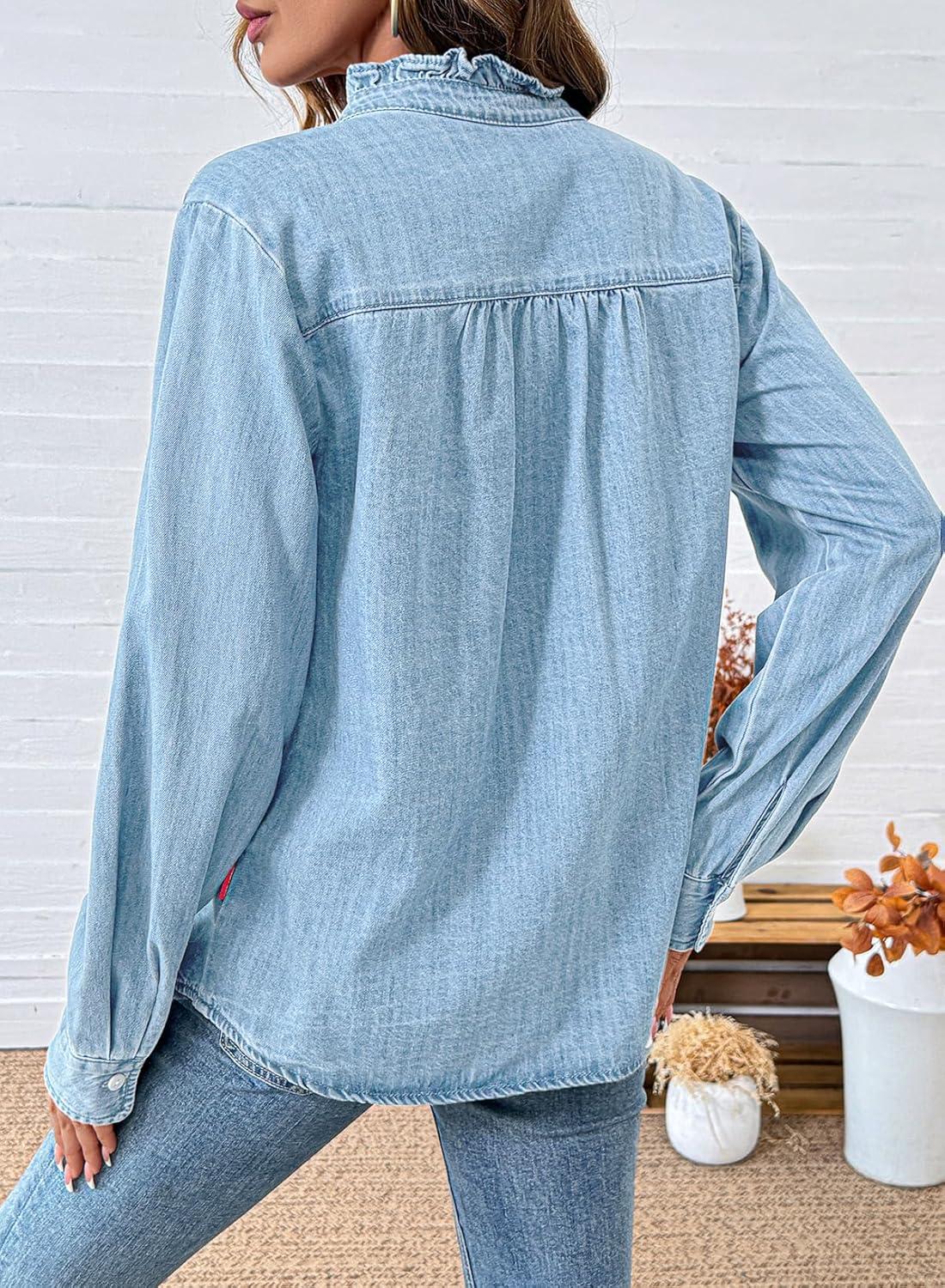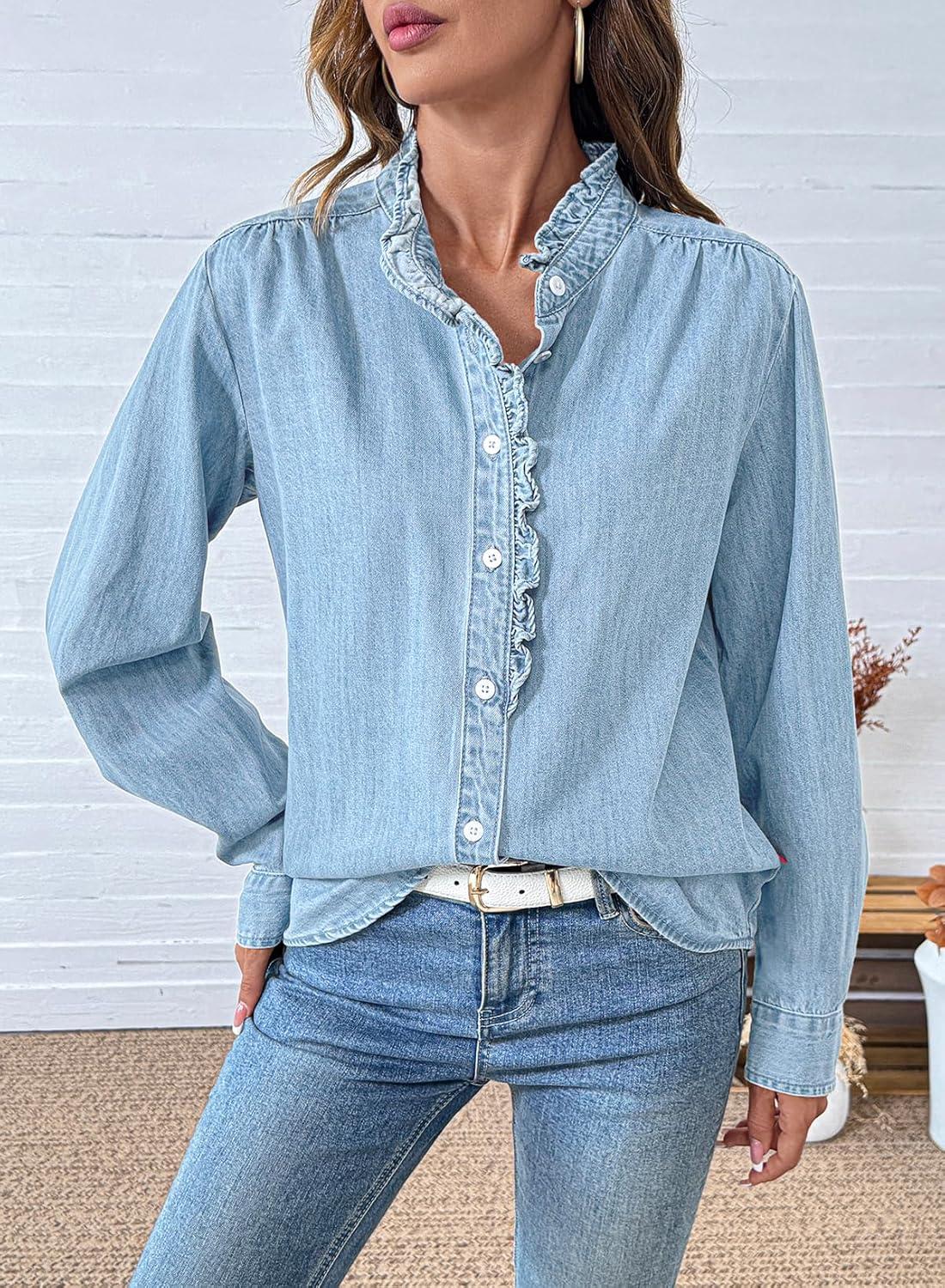 Sidefeel Womens Denim Shirt Button Down Long Sleeve Ruffled Edge Jean Blouses Tops(Iceland Blue)