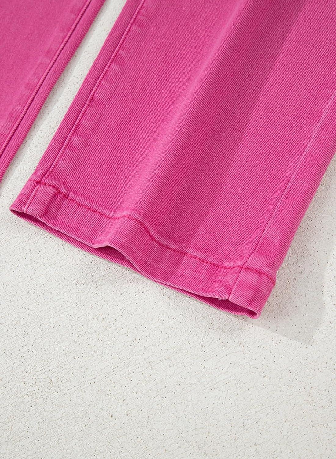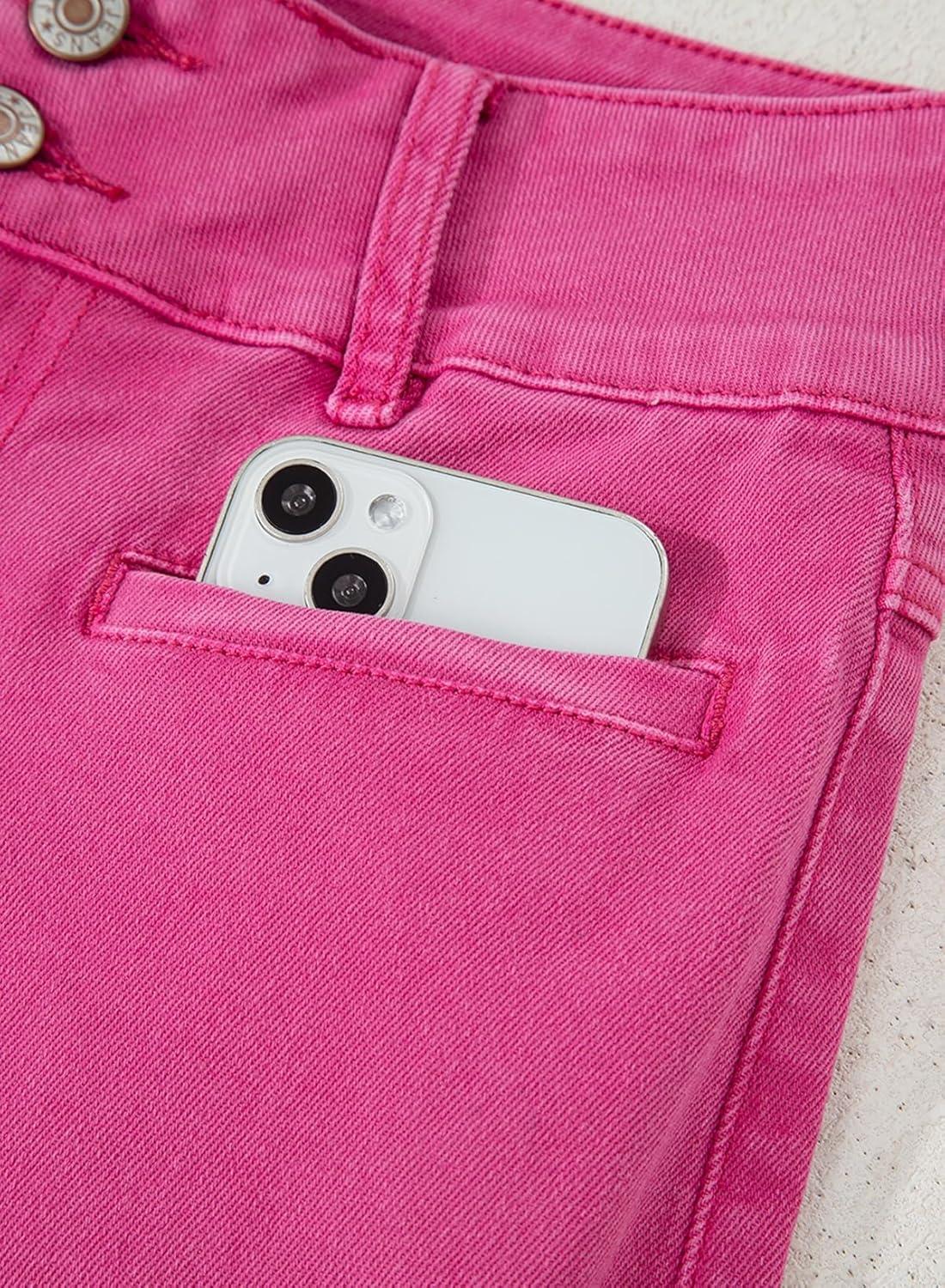 These high-waisted, stretchy jeans with straight leg design and welt pockets are a wardrobe essential for women seeking trendy and versatile denim pants.