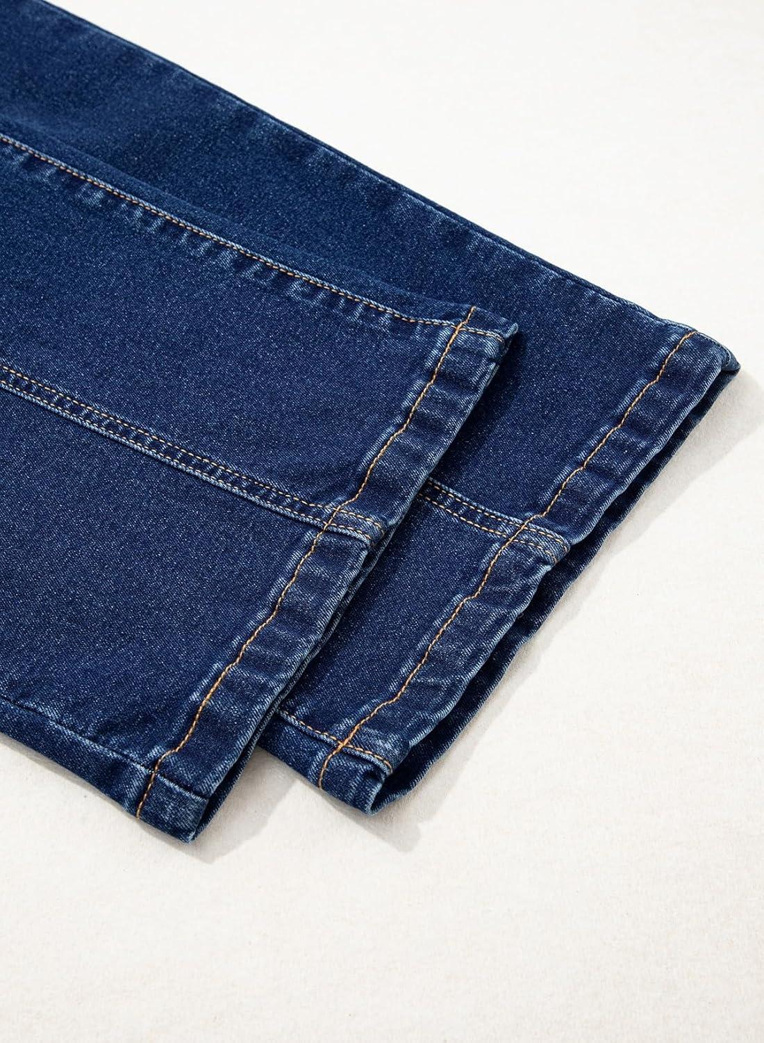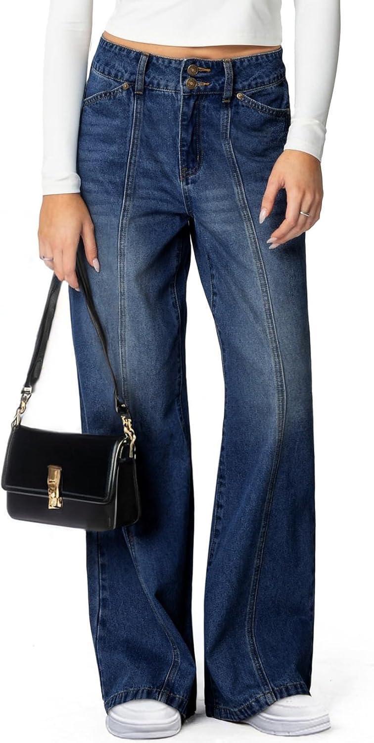 Sidefeel Women's Wide Leg Jeans High Waisted Stretchy Straight Leg Jeans Trendy Seamed Front Loose Denim Pants(Deep Blue)