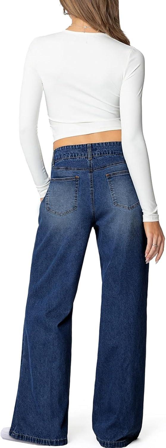 Sidefeel Women’s Wide Leg Jeans High Waisted Stretchy Straight Leg Jeans Trendy Seamed Front Loose Denim Pants(Deep Blue)