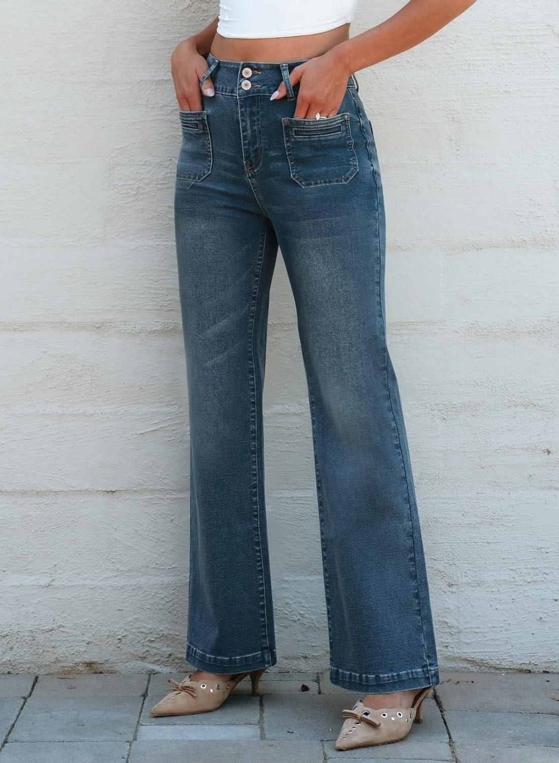 Sidefeel Women’s Wide Leg Jeans High Waisted Tummy Control Stretchy Pockets Front Straight Leg Jeans(Real Teal)