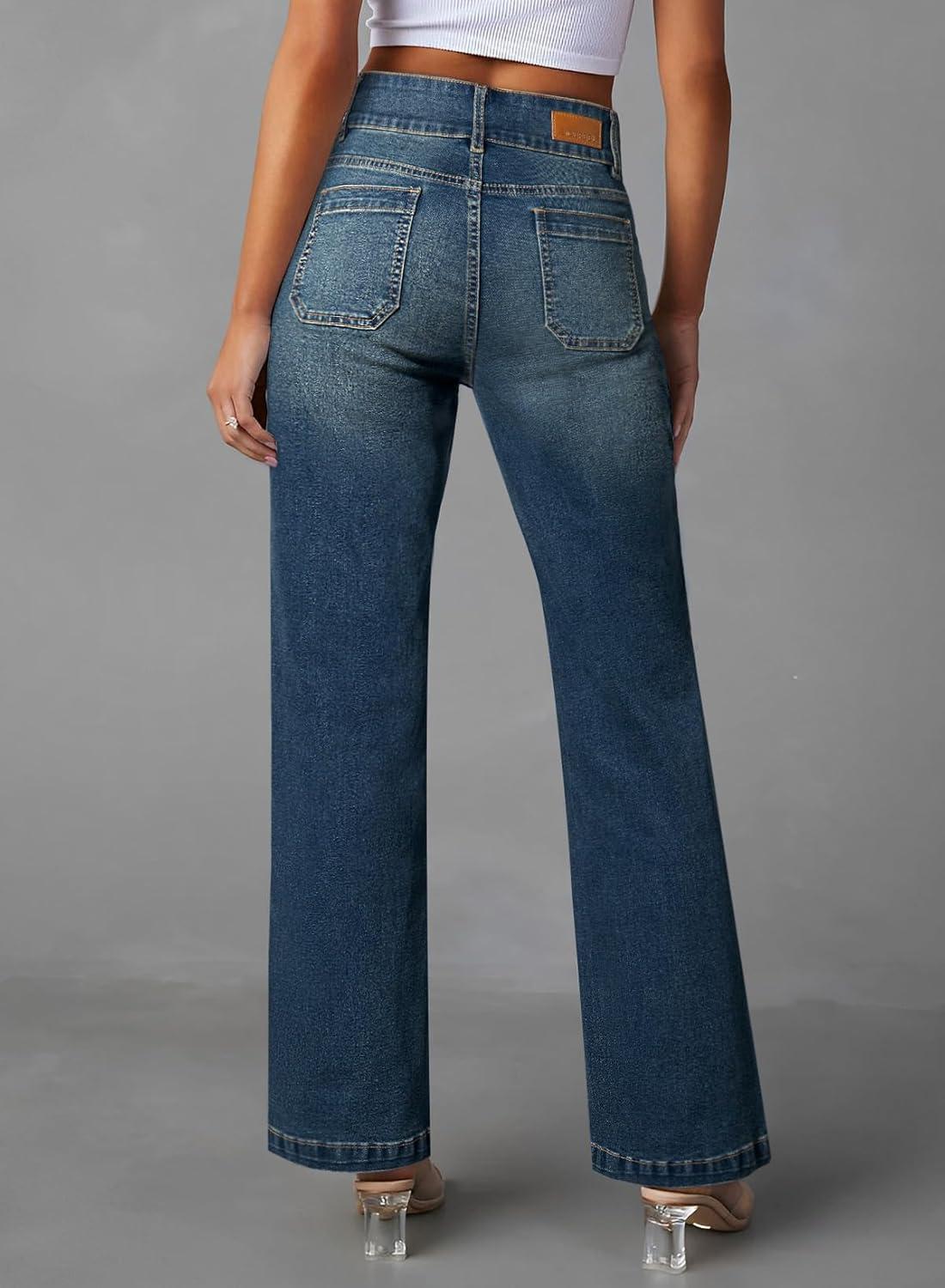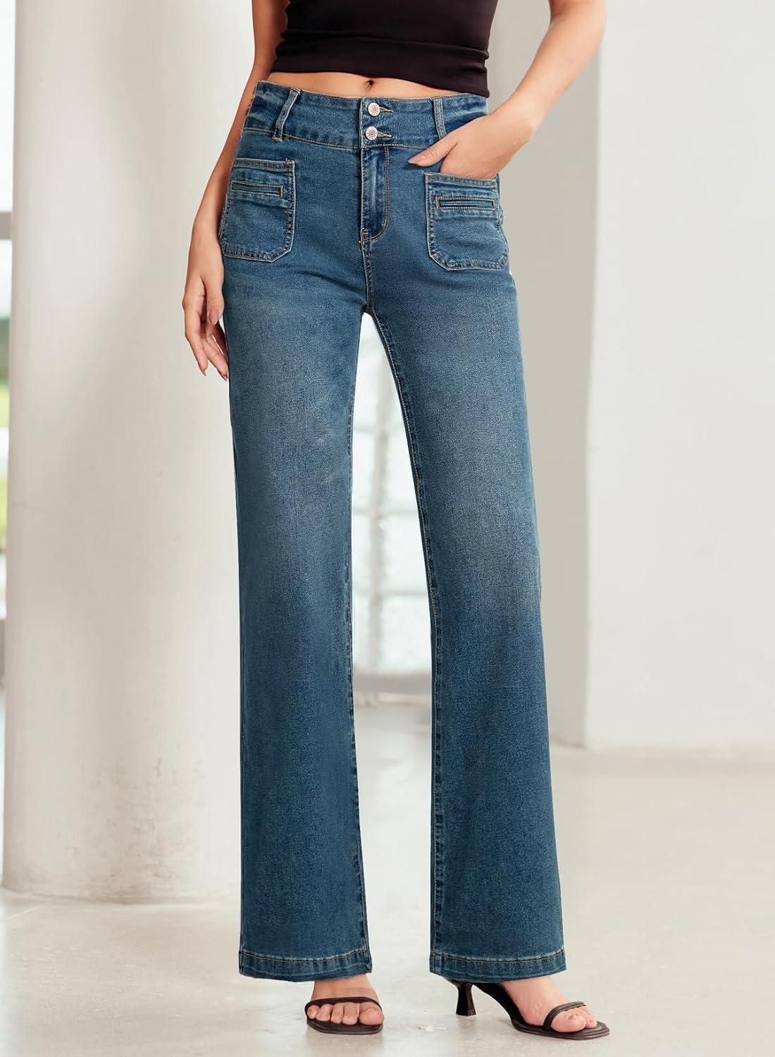 Sidefeel Women’s Wide Leg Jeans High Waisted Tummy Control Stretchy Pockets Front Straight Leg Jeans(Sky Blue)