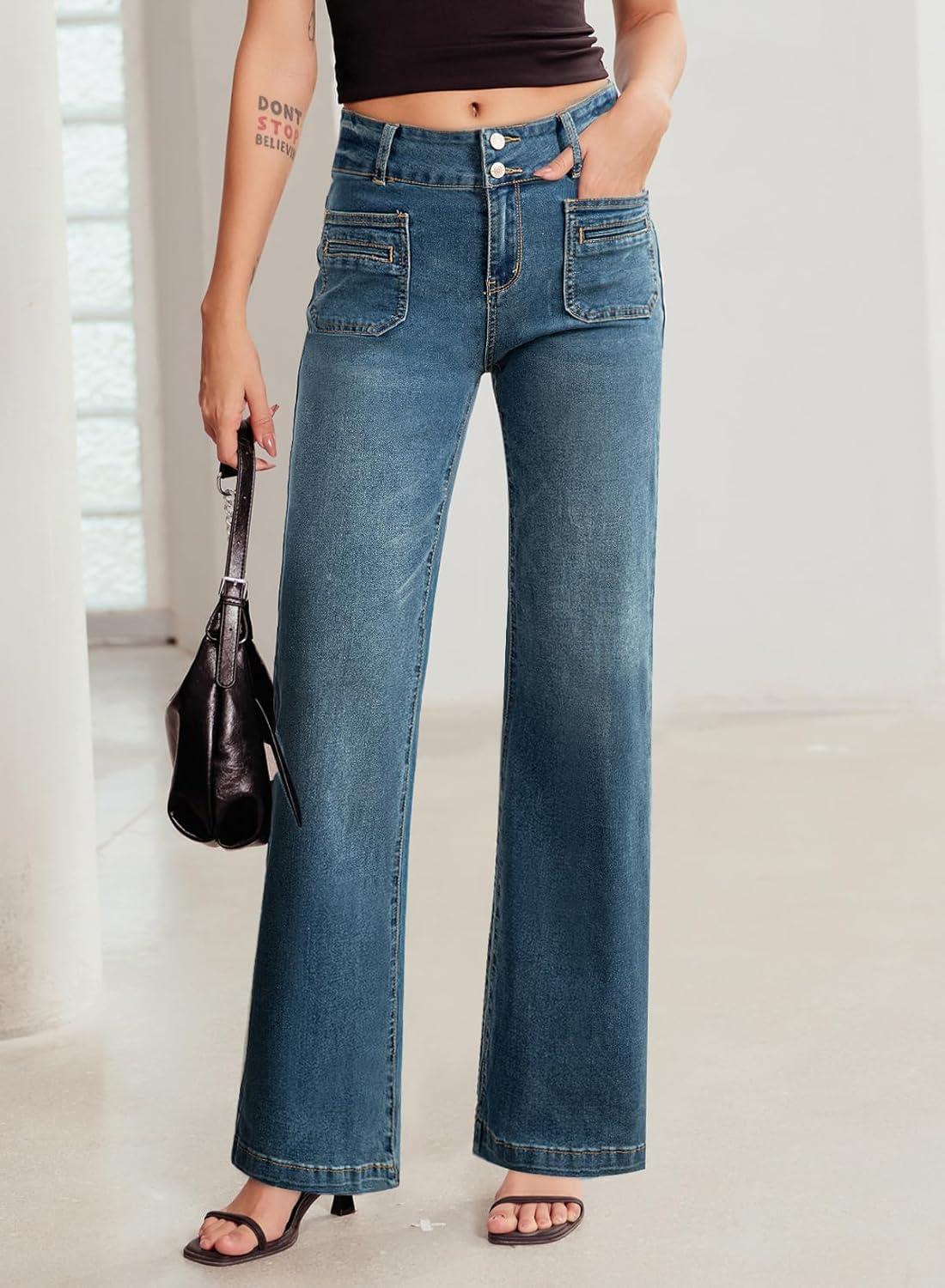Sidefeel Women’s Wide Leg Jeans High Waisted Tummy Control Stretchy Pockets Front Straight Leg Jeans(Light Blue)